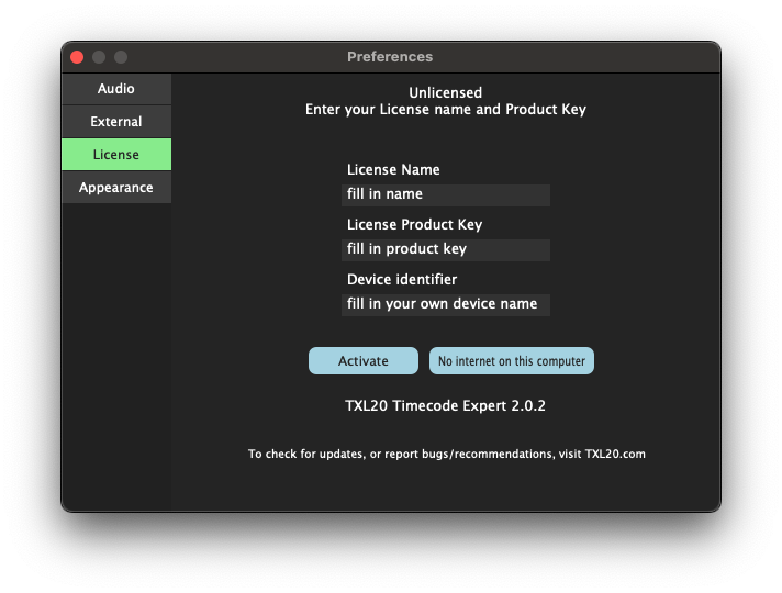 Now you can click the [Download License] button, for the device you just activated. Copy this "License.txlic" file to the device you want to activate, and place it in the "~/Documents/TXL20/Timecode Expert/" folder.