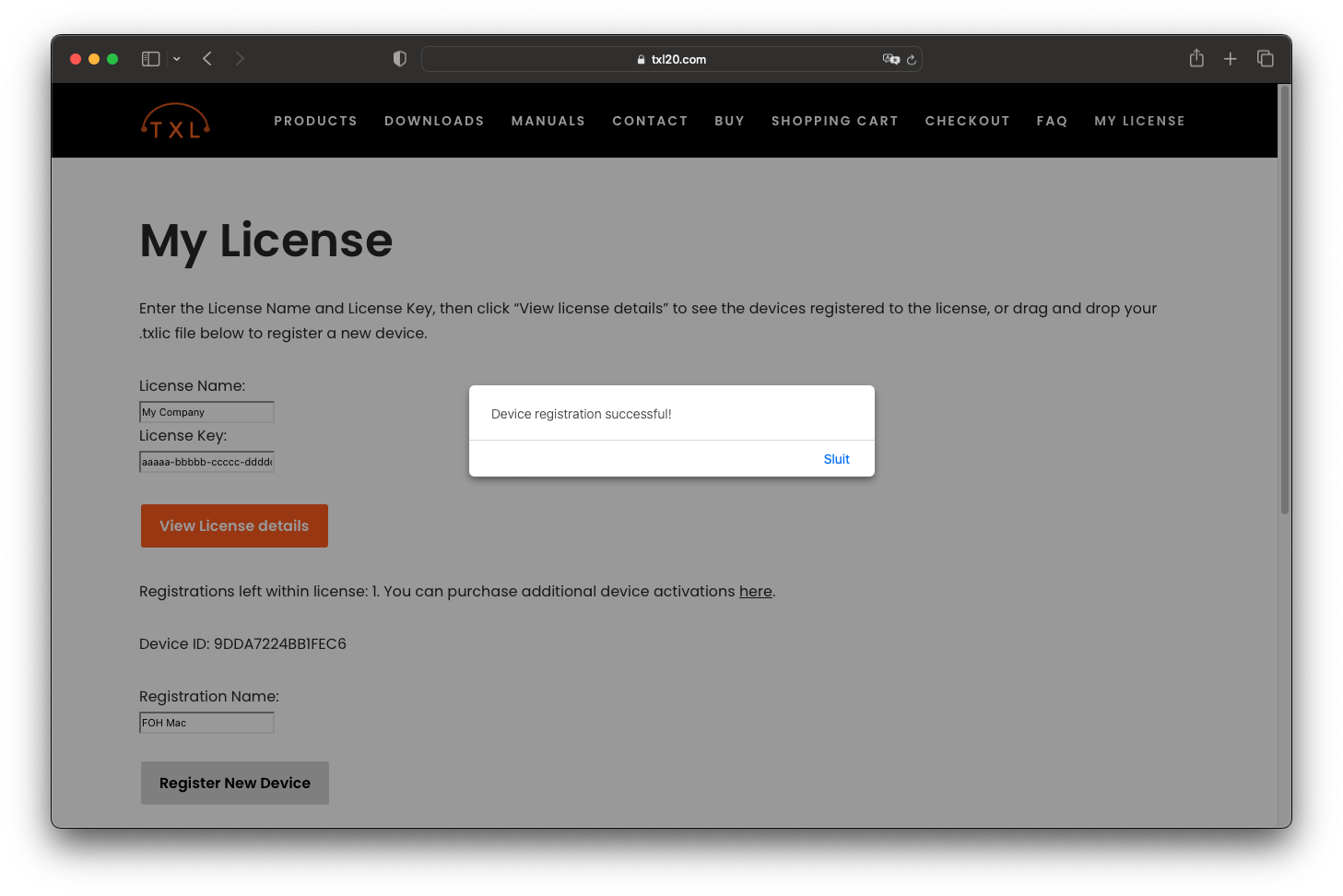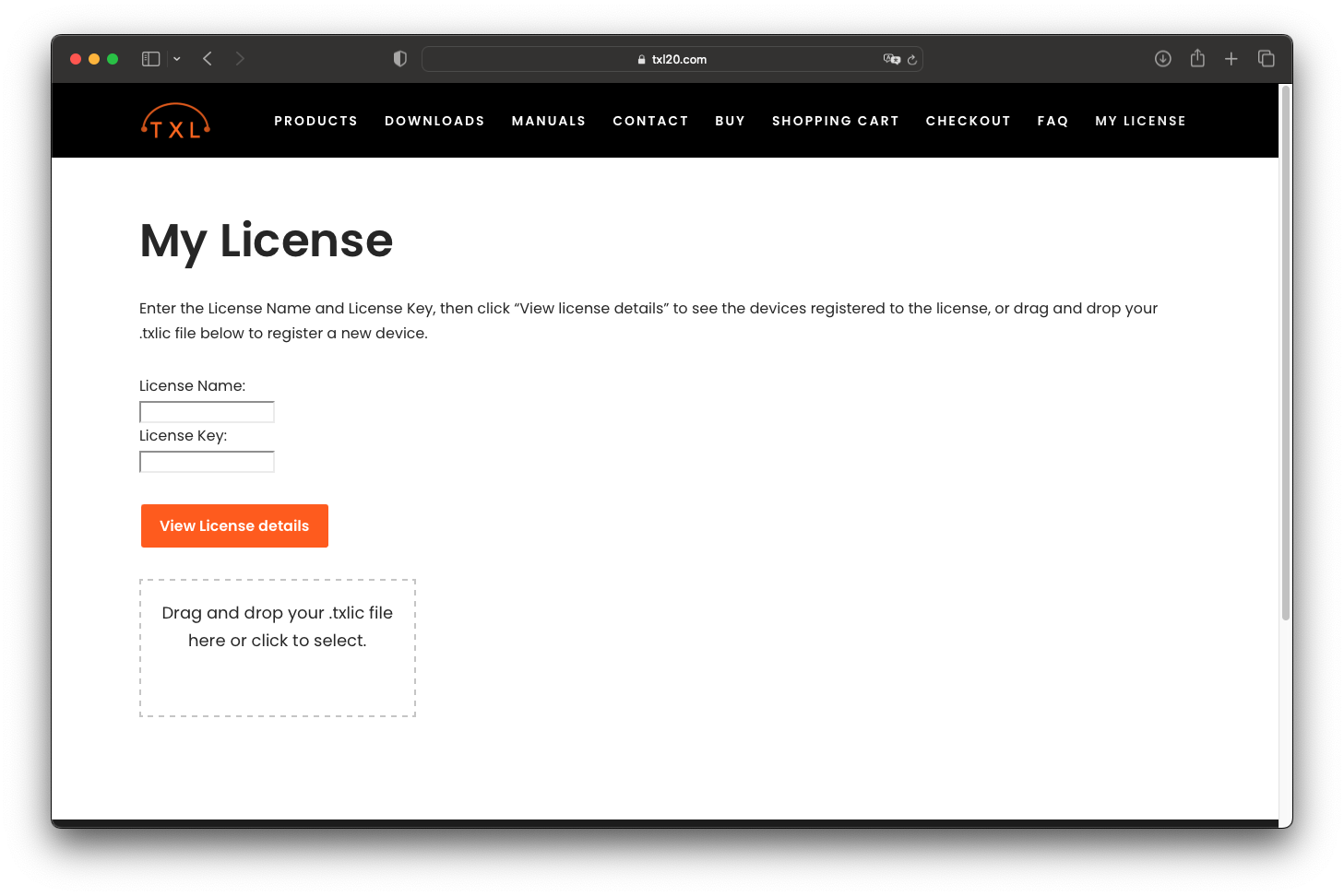 On a computer connected to the internet, go to https://txl20.com/mylicense/, and drop the unsigned license file in the designated space.