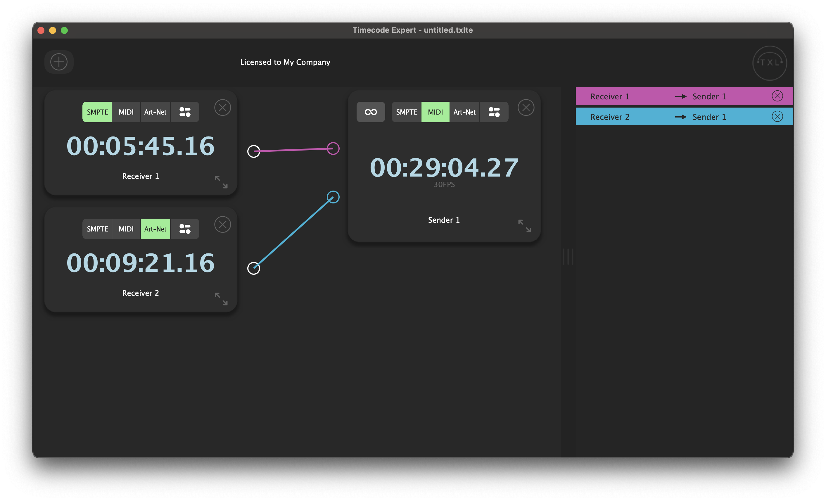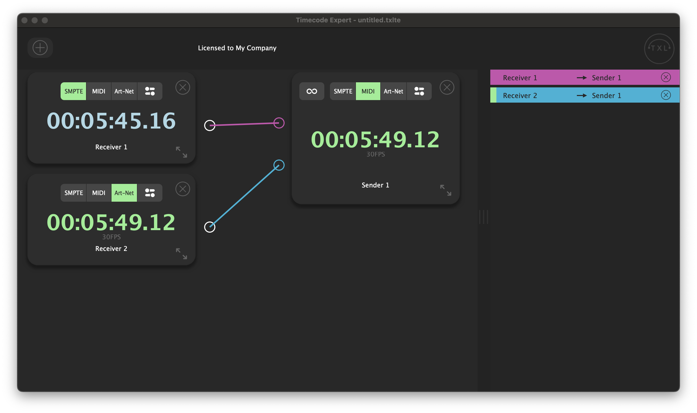 In order to improve the redundancy of your timecode conversion, you can use multiple receivers, that will route into a single sender. In the example below, we have two receivers running, SMPTE and Art-Net, with approximately the same timing. We choose the SMPTE timecode stream as the preferred timecode source, and the Art-Net timecode stream as the alternative timecode source. Below, both sources are running and the sender will use the top routing, i.e. the SMPTE source for the timecode conversion.