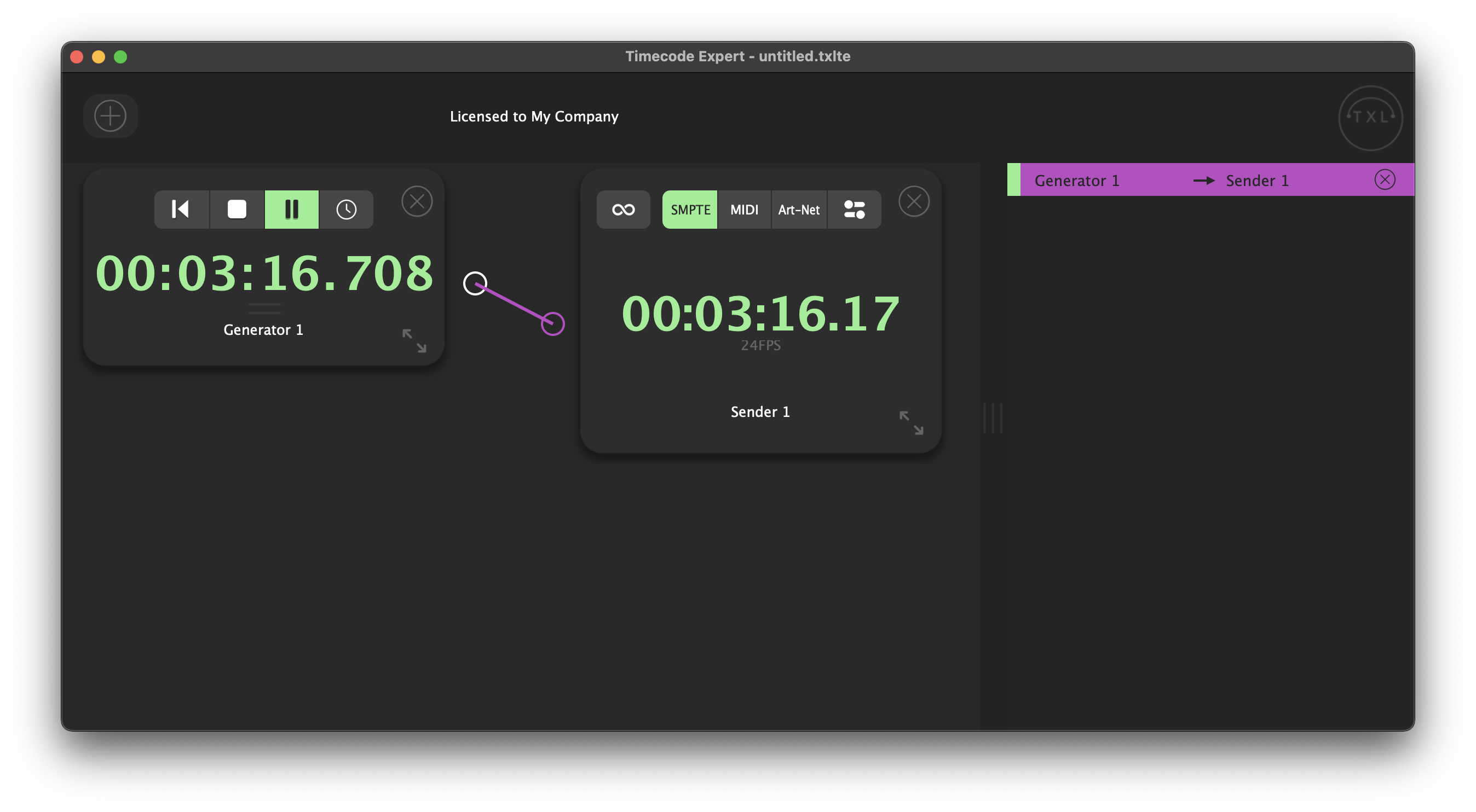 When you have a left-side component running, for example a Generator, and you draw a routing from the Generator to your SMPTE Sender, SMPTE will be outputted over the selected audio channel.