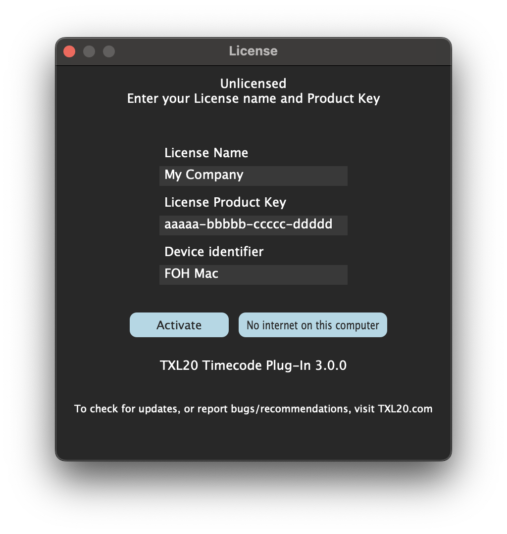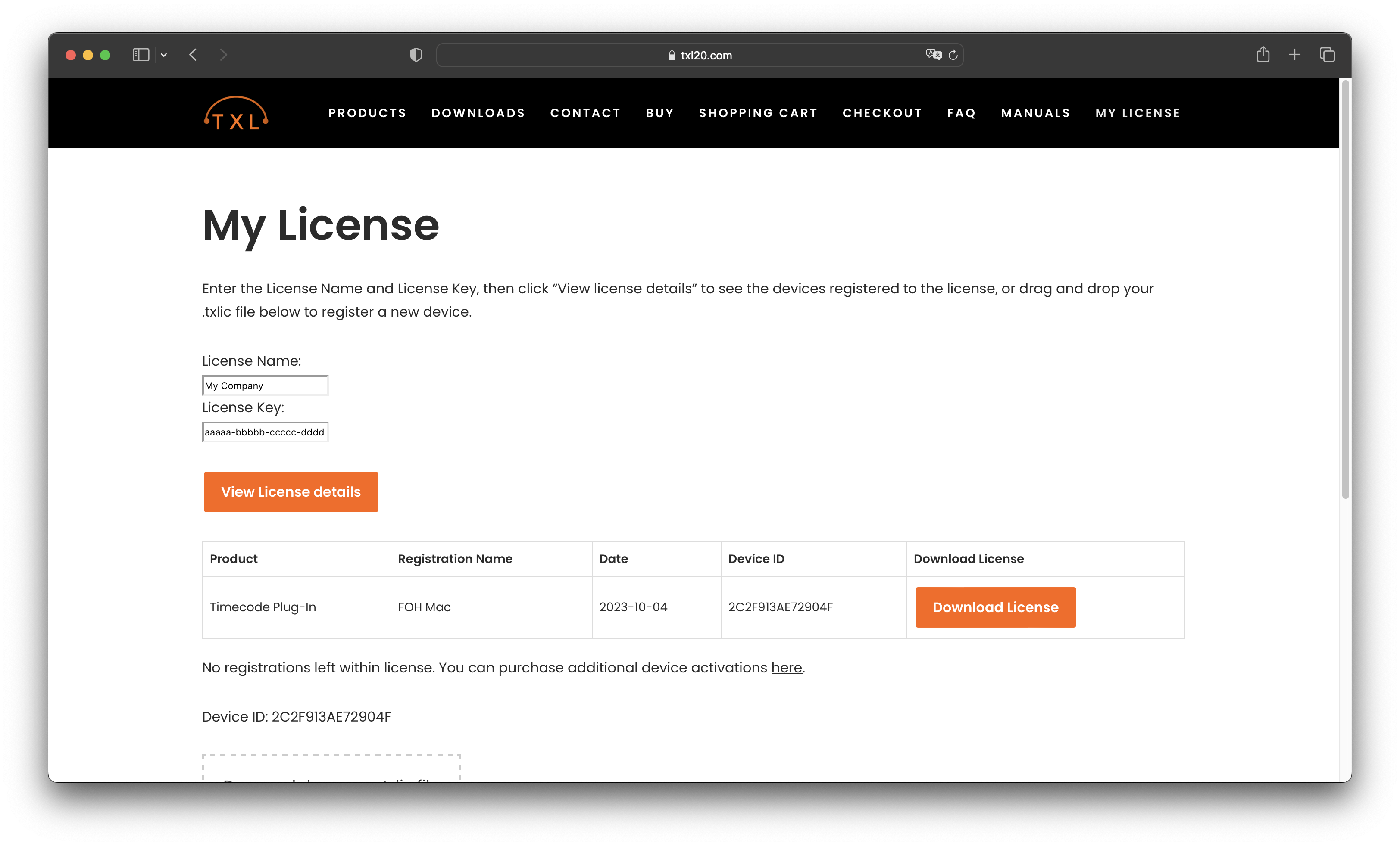 Now you can click the [Download License] button, for the device you just activated. Copy this "License.txlic" file to the device you want to activate, and place it in the "~/Documents/TXL20/Timecode Plug-In/" folder.