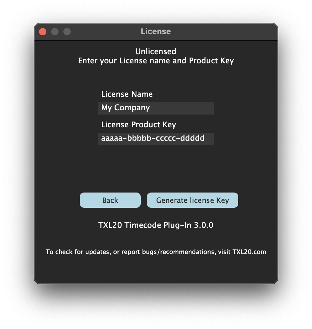 As show in the window now, you have to take the just created unsigned license file "License_unsigned.txlic" in "~/Documents/TXL20/Timecode Plug-In/" and copy it to a computer with an internet connection.